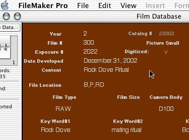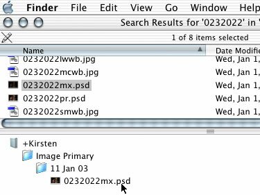 Lets say Im searching for an image I know I worked on, processed and developed several different versions beyond the basic image capture file. First, Ill search my image database by using its search engine and some of the descriptive keyword fields. Once it finds the appropriate image and its associated file number, I then use my computersan Apple G4 PowerMacsearch engine to find any files with that number sequence. The results usually return in less than five seconds. From within Sherlockthe Apple search engineI can open any of those files by simply double-clicking it. The whole process is quite slick. I use my database and all of its fields to create practically unlimited numbers of queries. Once the file numbers are found, I use my computers extremely fast search capabilities to find the particular files. Its quite fast.